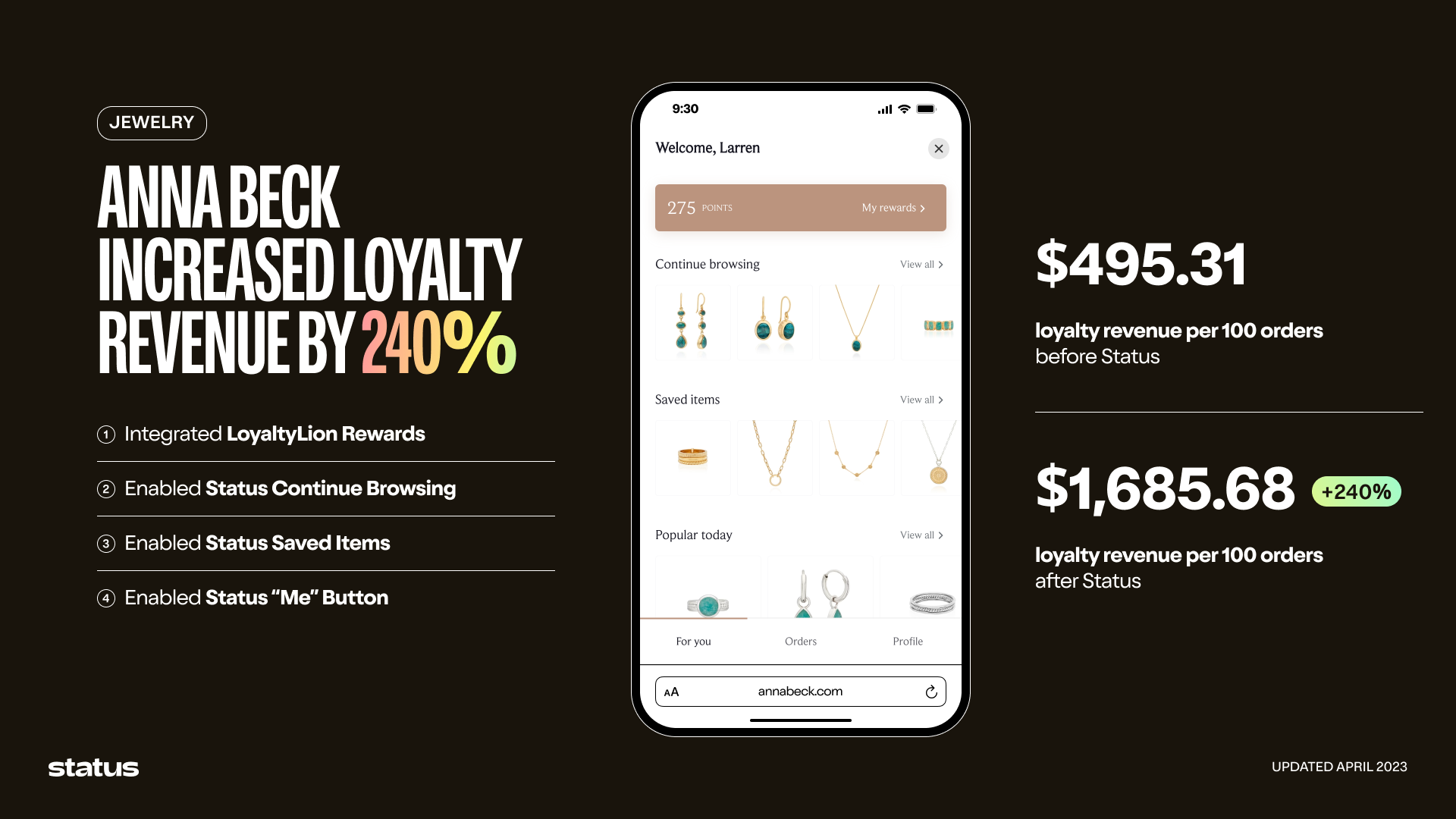 Anna Beck launched Status to improve their signed-in shopping experience. In addition to using our login and shopping tools, Anna Beck enabled our LoyaltyLion integration to display points in the account. With the integration active Anna Beck increased loyalty program enrollment by 318% and loyalty revenue by 240%.